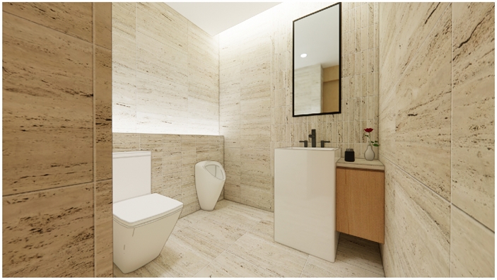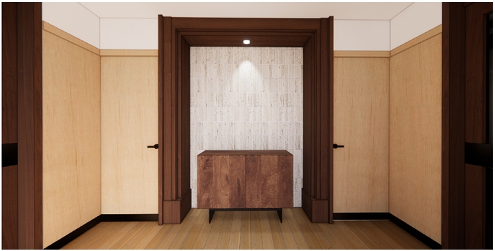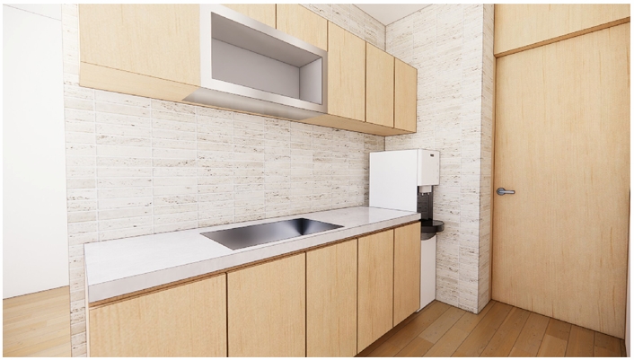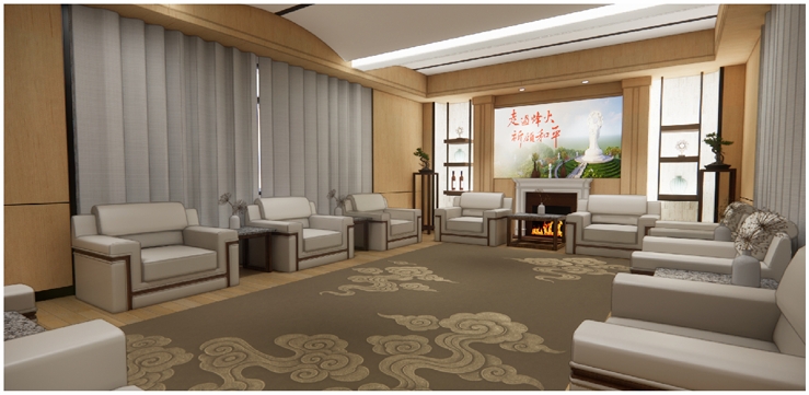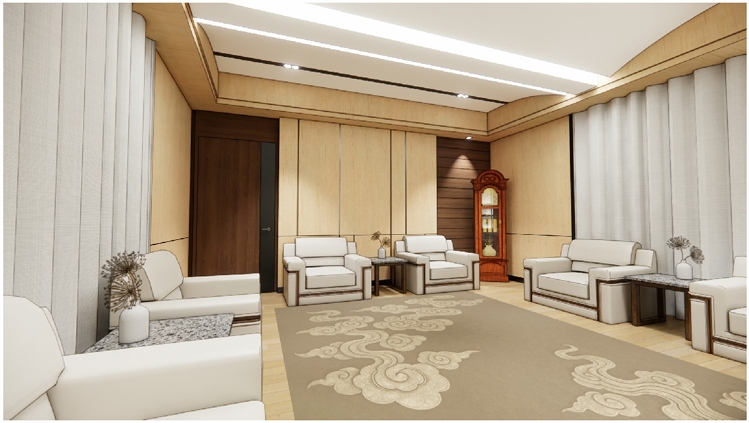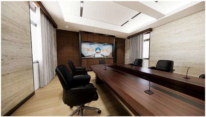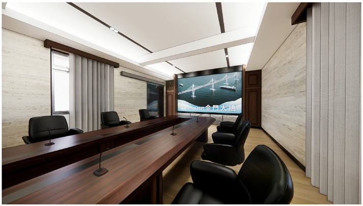 本案規劃15人固定席位會議室及10人固定席位會客室,使用空間結合金門主題及元素進行設計,以樑柱美化、複式照明及牆面吸音材質等設計,打造專業、舒適的空間氛圍,同時配合整體空間規劃,將線路、設備及門扇做隱藏式設計,營造簡潔明亮的使用環境。同時於會議室及會客室之間依使用功能整體設計布局,打造複合式多功能空間,包括機電室、茶水間及衛生間等使用需求。該區域作為連結大門、會議室及會客室之間的緩衝地帶,整合入口的功能形象以及抽象概念的轉化,打造具指認意義的入口意象。